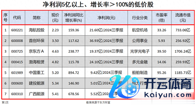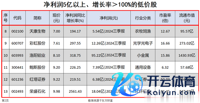 在2024年三季报中,净利润大于10亿元www.kaiyun.com,净利润增长率>100%,股价低于10元且非ST的A股上市公司,沪深阛阓中仅存7家;此外,还有 6 家净利润处于5至10亿元的廉价绩优股。
