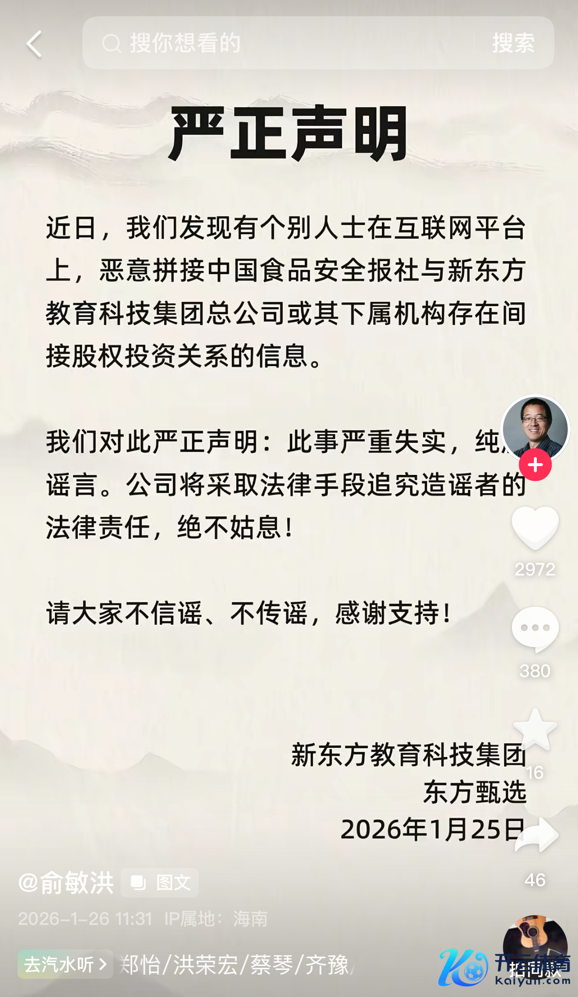 俞敏洪辟谣中国食物安全报社与新东方存在盘曲股权投资干系:严重舛错kaiyun平台登录入口俞敏洪辟谣中国食物安全报社与新东方存在盘曲股权投资干系:严重舛错