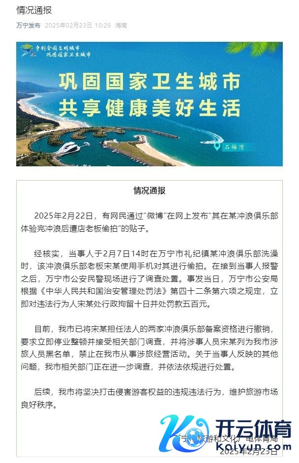 央视网音问:2月23日www.kaiyun.com,海南万宁市旅游和文化广电体育局通报,2025年2月22日,有网民通过“微博”在网上反应“其在某冲浪俱乐部体验完冲浪后遭店雇主偷拍”。