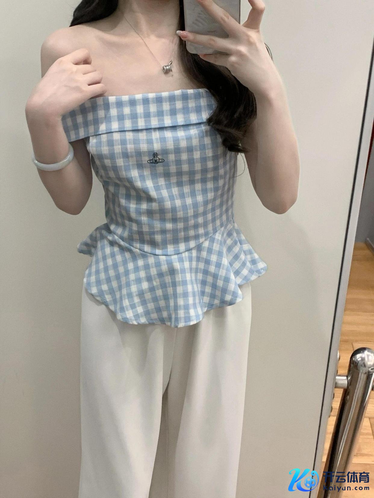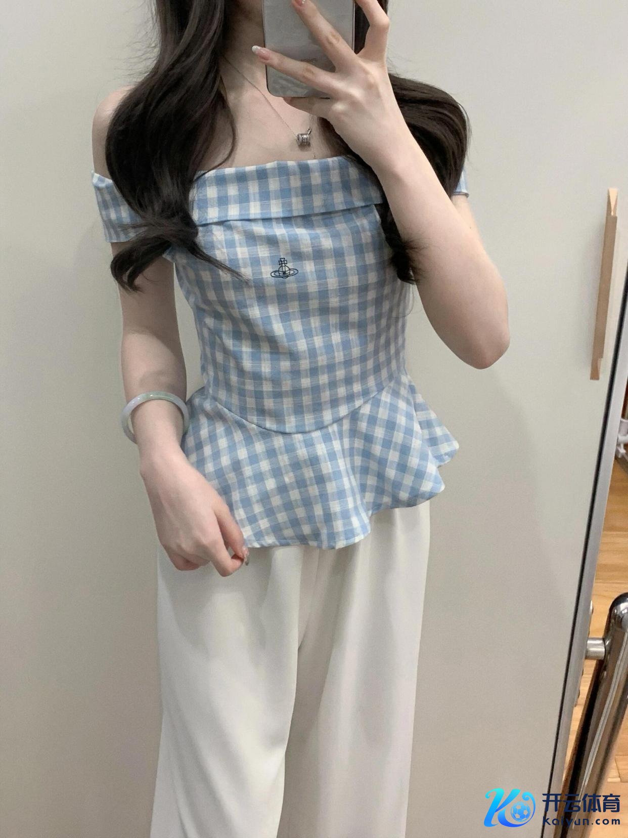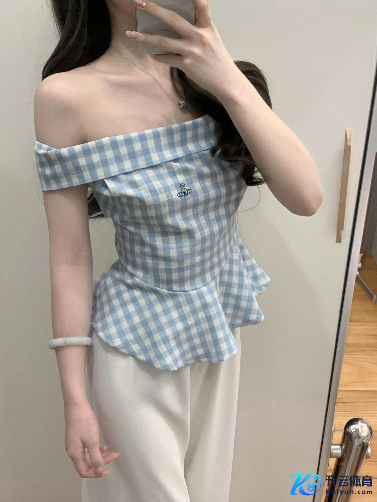 #质感创作主谈主#在前卫的舞台上www.kaiyun.com,蓝白格一字肩短袖上衣搭配白色阔脚裤,能展现出私有的魔力。